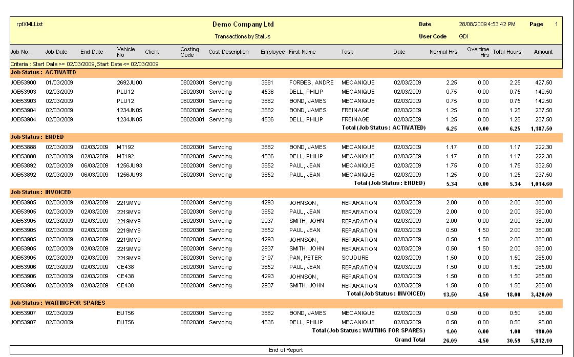 The system allows you to define your own job status and assign different colours to them to easily visualise follow-up of work done on each vehicle.